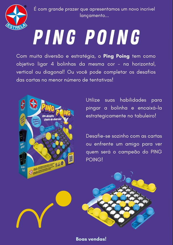 Cód.: 825581 Um jogo com muita ação e estratégia. O Ping Poing tem como objetivo ligar 4 bolinhas da mesma cor – na horizontal, vertical ou diagonal. Utilizando suas habilidades, os jogadores devem pingar a bolinha e encaixá-la estrategicamente no tabuleiro! O