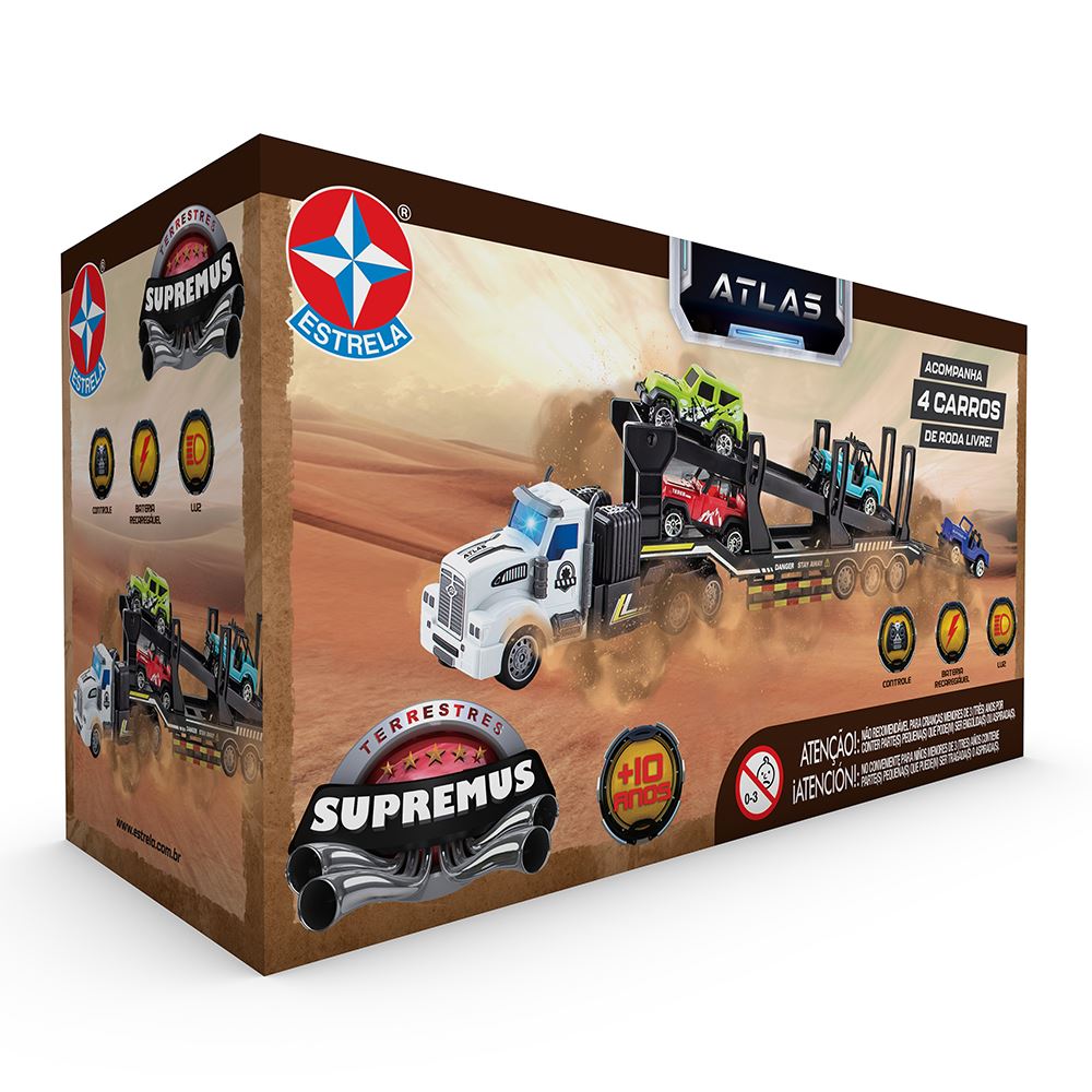 O Supremus Atlas é um caminhão cegonha de controle remoto movido a bateria recarregável de lítio (inclusa) e com 7 funções. Sua carroceria é de plástico, e permite soltar a carreta do cavalo, trazendo ainda mais versatilidade ao veículo. E além disso, inclui 4 carros de roda livre, para enriquecer ainda mais o conjunto.